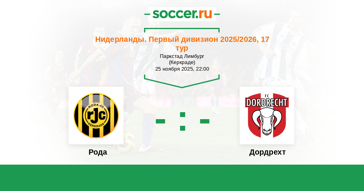 Нидерланды. Первый дивизион 18.09.2020 Рода Логотип футбольный клуб Рода (Керкраде) 4:0 Логотип футбольный клуб Дордрехт Дордрехт