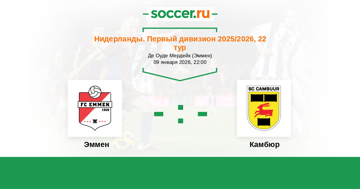 Нидерланды. Первый дивизион 26.02.2010 Эммен Логотип футбольный клуб Эммен 2:4 Логотип футбольный клуб Камбюр (Лиуварден) Камбюр