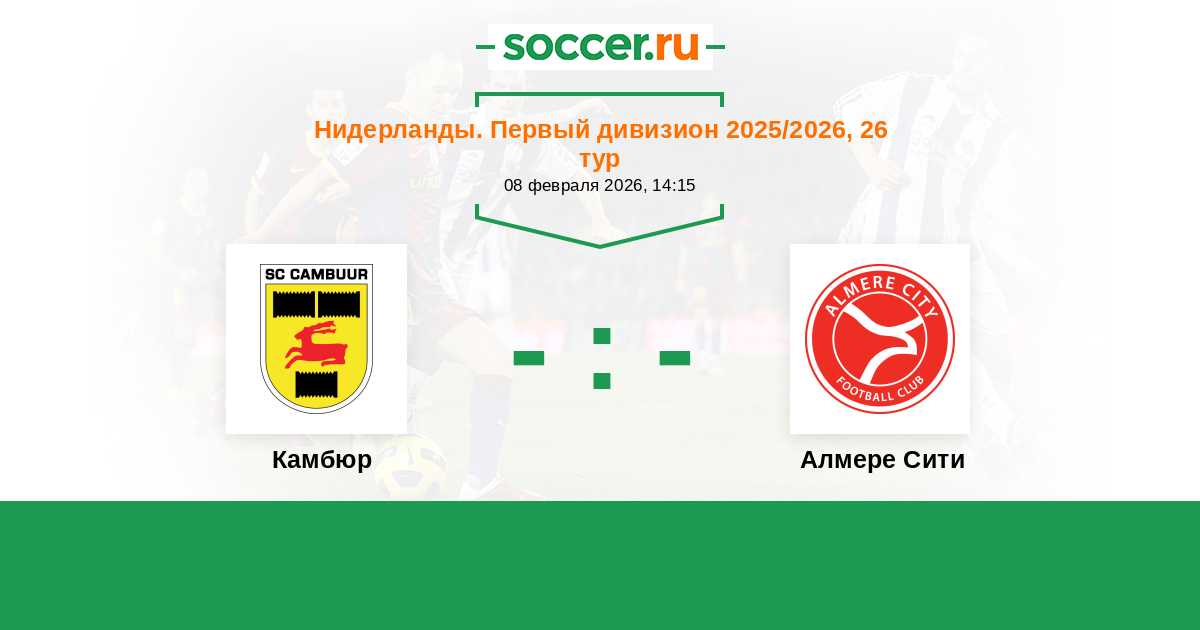 Нидерланды. Первый дивизион 17.02.2017 Алмере Сити Логотип футбольный клуб Алмере Сити 0:1 Логотип футбольный клуб Камбюр (Лиуварден) Камбюр