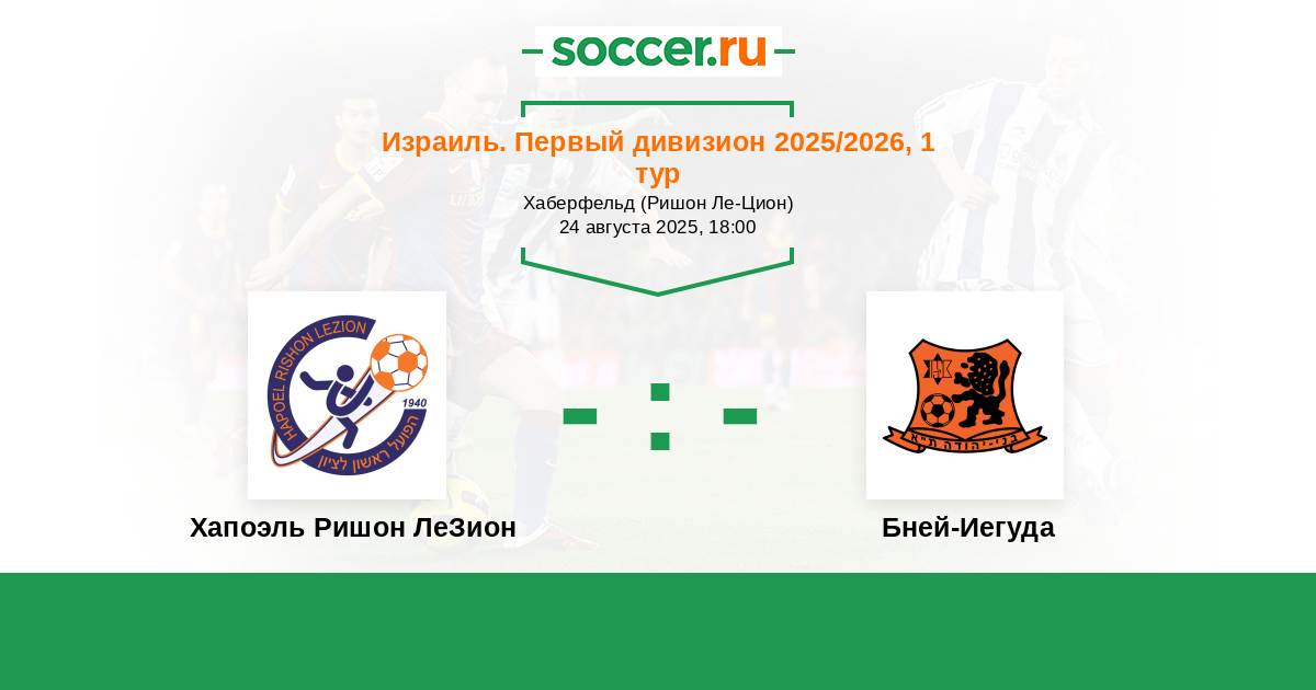 Израиль. Первый дивизион 25.08.2022 Бней-Иегуда Логотип футбольный клуб Бней-Иегуда (Тель-Авив) 2:2 Логотип футбольный клуб Хапоэль Ришон ЛеЗион Хапоэль Ришон ЛеЗион