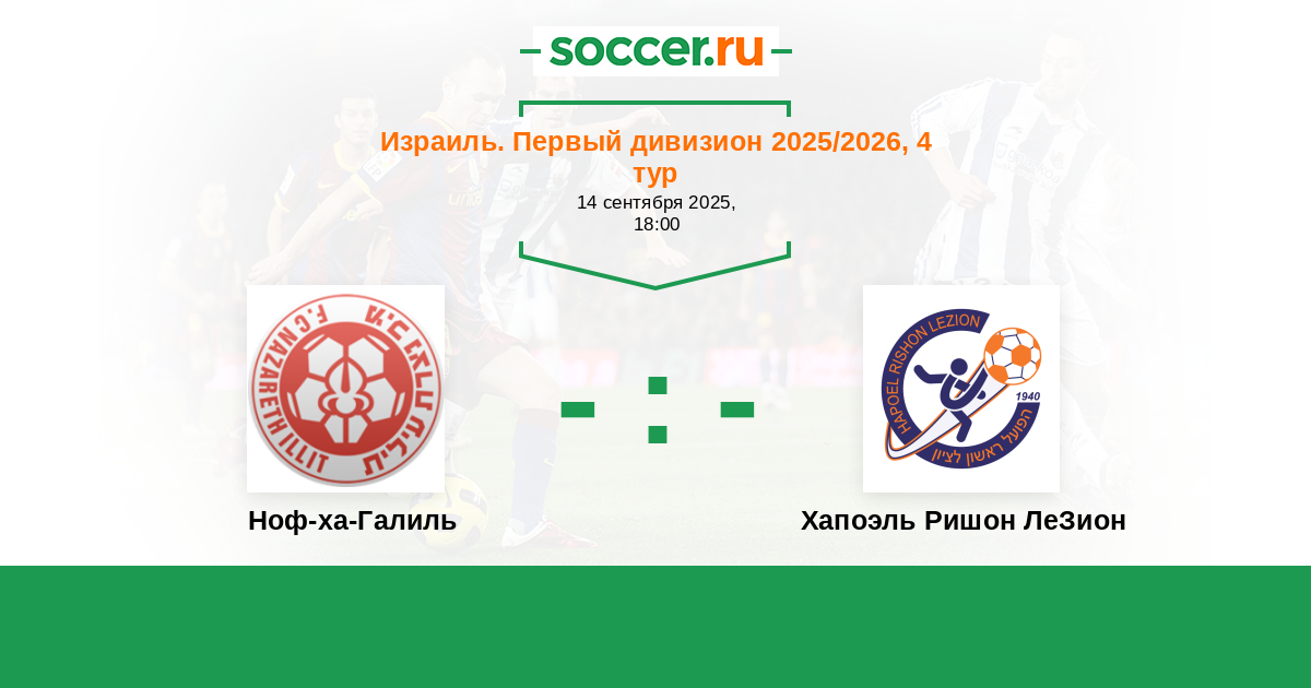 Израиль. Первый дивизион 16.01.2026 Хапоэль Ришон ЛеЗион Логотип футбольный клуб Хапоэль Ришон ЛеЗион 0:0 Логотип футбольный клуб Ноф-ха-Галиль (Назарет Иллит) Ноф-ха-Галиль