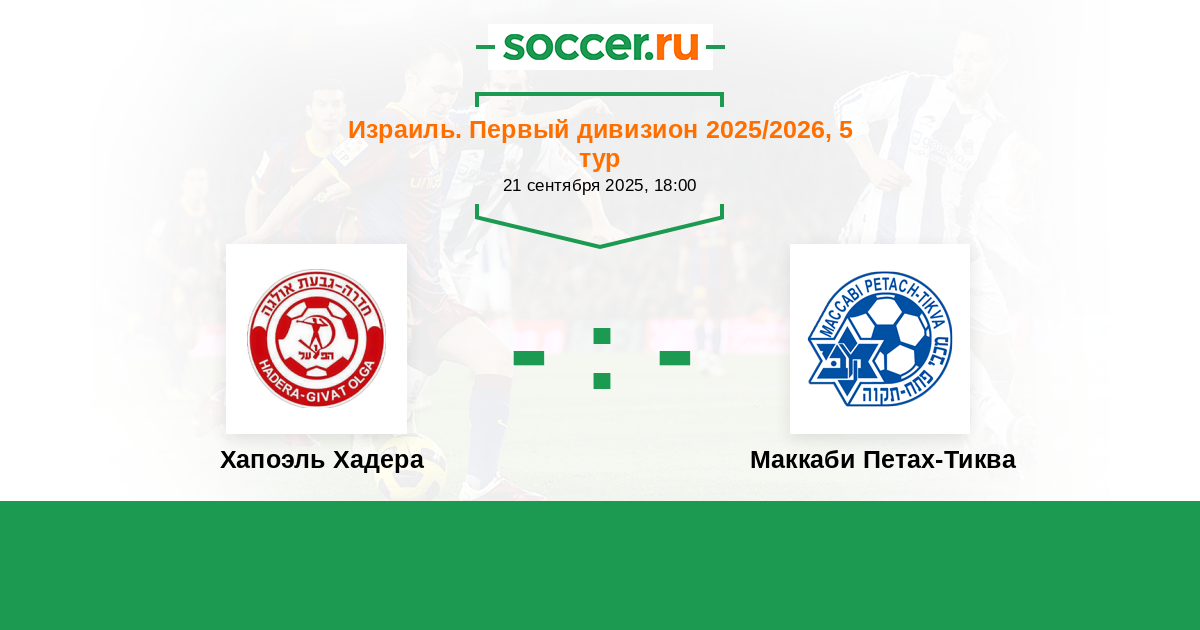 Израиль. Премьер-Лига 15.09.2018 Маккаби Петах-Тиква Логотип футбольный клуб Маккаби Петах-Тиква 1:1 Логотип футбольный клуб Хапоэль Хадера Хапоэль Хадера