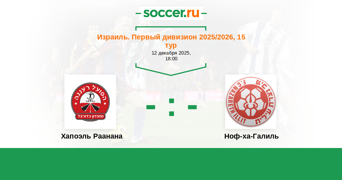 Израиль. Первый дивизион 20.12.2024 Ноф-ха-Галиль Логотип футбольный клуб Ноф-ха-Галиль (Назарет Иллит) 0:0 Логотип футбольный клуб Хапоэль Раанана Хапоэль Раанана