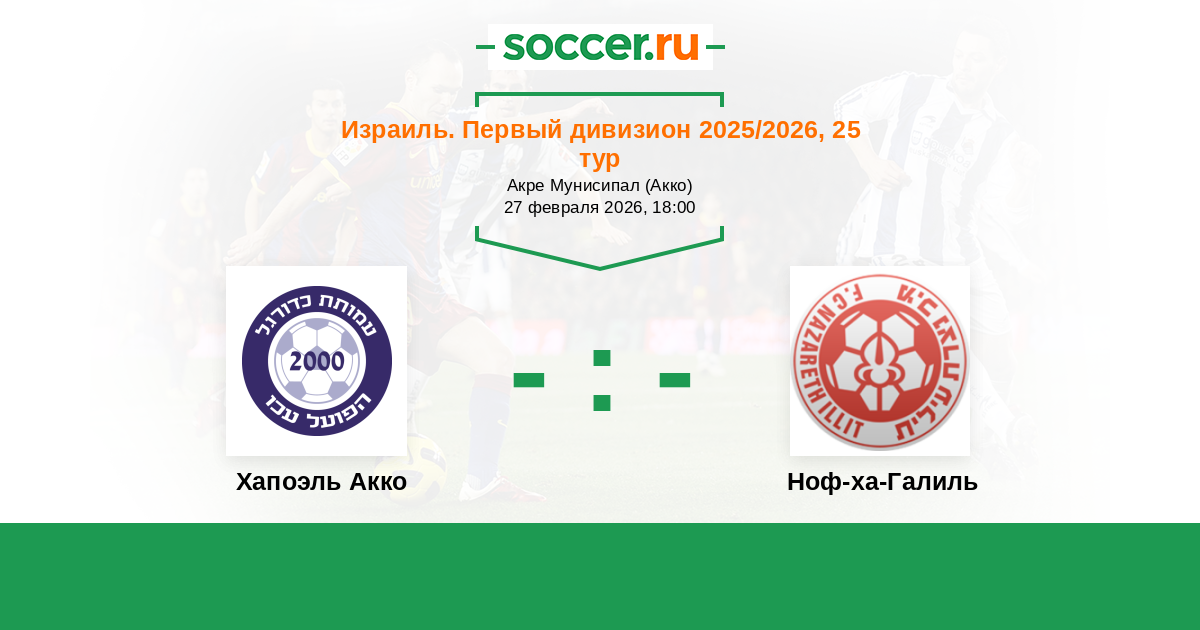 Израиль. Первый дивизион 11.02.2019 Ноф-ха-Галиль Логотип футбольный клуб Ноф-ха-Галиль (Назарет Иллит) 0:0 Логотип футбольный клуб Хапоэль Акко Хапоэль Акко