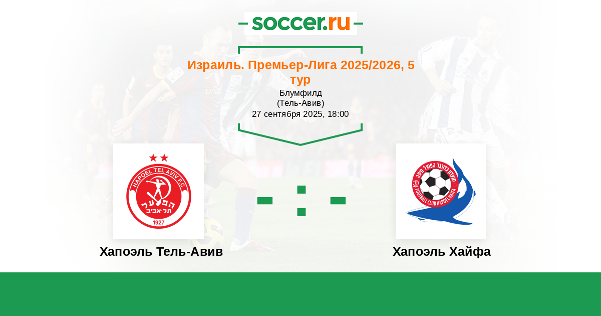 Израиль. Премьер-Лига 19.09.2015 Хапоэль Хайфа Логотип футбольный клуб Хапоэль Хайфа 0:1 Логотип футбольный клуб Хапоэль Тель-Авив Хапоэль Тель-Авив