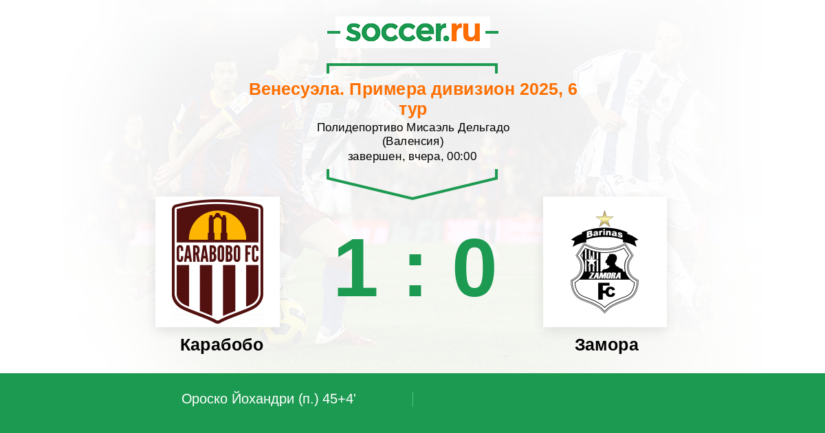 Венесуэла. Примера дивизион 20.03.2019 Замора Логотип футбольный клуб Замора (Баринас) 1:0 Логотип футбольный клуб Карабобо (Валенсия) Карабобо