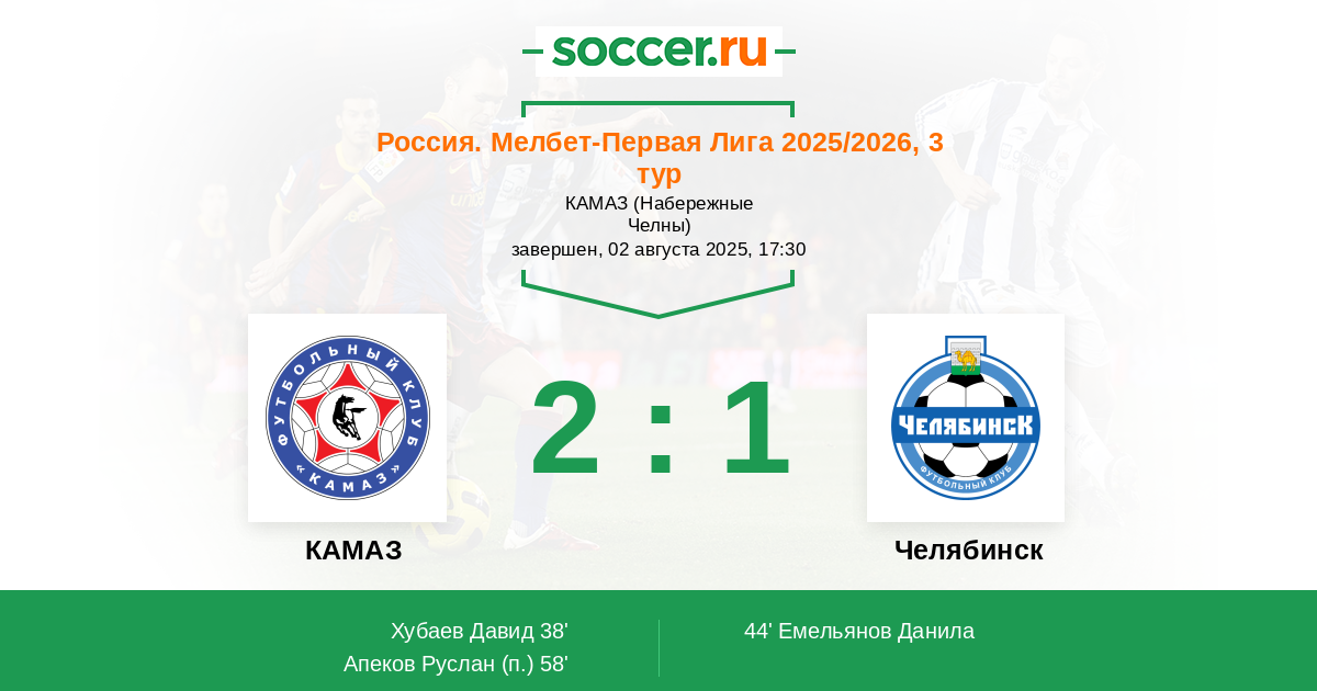 Россия. Вторая лига. Группа 4 03.08.2018 Челябинск Логотип футбольный клуб Челябинск 0:1 Логотип футбольный клуб КАМАЗ (Набережные Челны) КАМАЗ