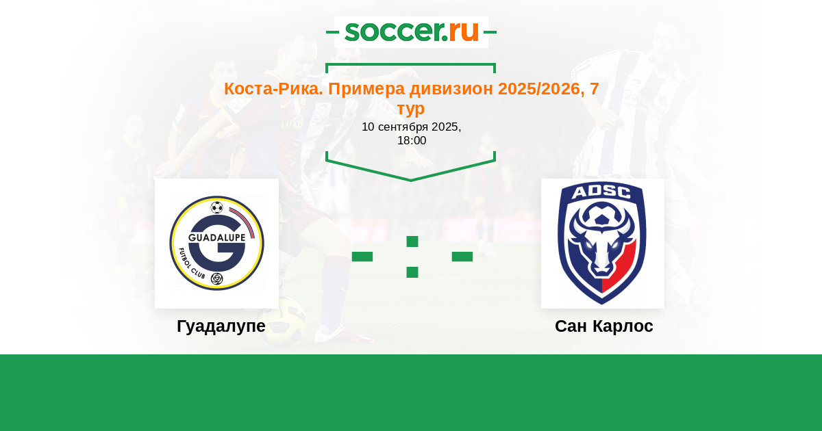Коста-Рика. Примера дивизион 03.09.2018 Гуадалупе Логотип футбольный клуб Гуадалупе 2:3 Логотип футбольный клуб Сан Карлос (Сьюдад Куэсада) Сан Карлос