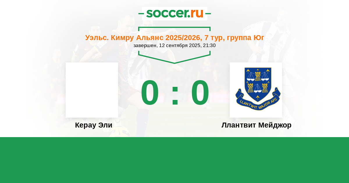 Керау Эли - Ллантвит Мейджор ! Данный чемпионат славится своей непредсказуемостью и результативностью . Что же касается сегодняшних соперников , то большинство очных встреч весьма голевые . Надеюсь эта исключением не будет .
