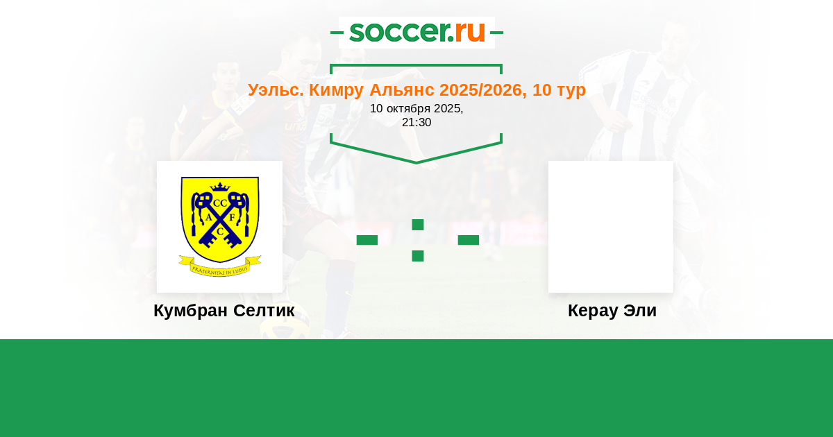 Кумбран Селтик - Керау Эли ! Хозяева в глубоком кризисе , находятся в опасной зоне и стоят первые в очередь на вылет . Гости же наоборот борются за лидерство . ТБ.