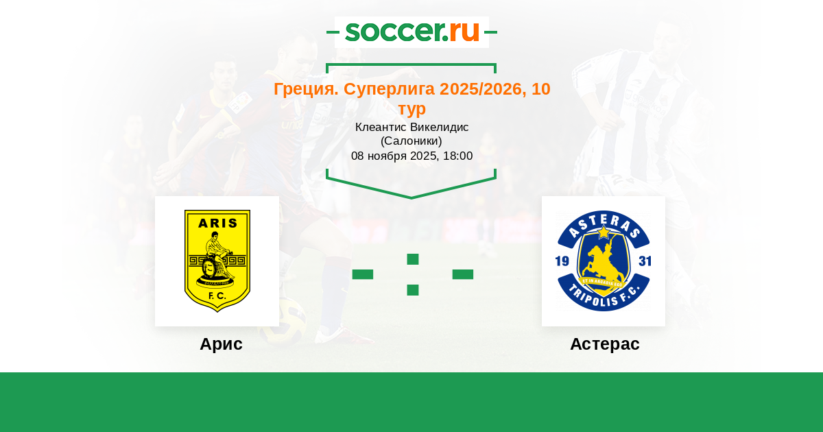 Греция. Суперлига 10.11.2019 Арис Логотип футбольный клуб Арис (Салоники) 2:1 Логотип футбольный клуб Астерас (Триполис) Астерас