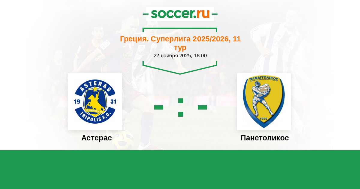 Греция. Суперлига 16.10.2022 Астерас Логотип футбольный клуб Астерас (Триполис) 0:0 Логотип футбольный клуб Панетоликос (Агринио) Панетоликос