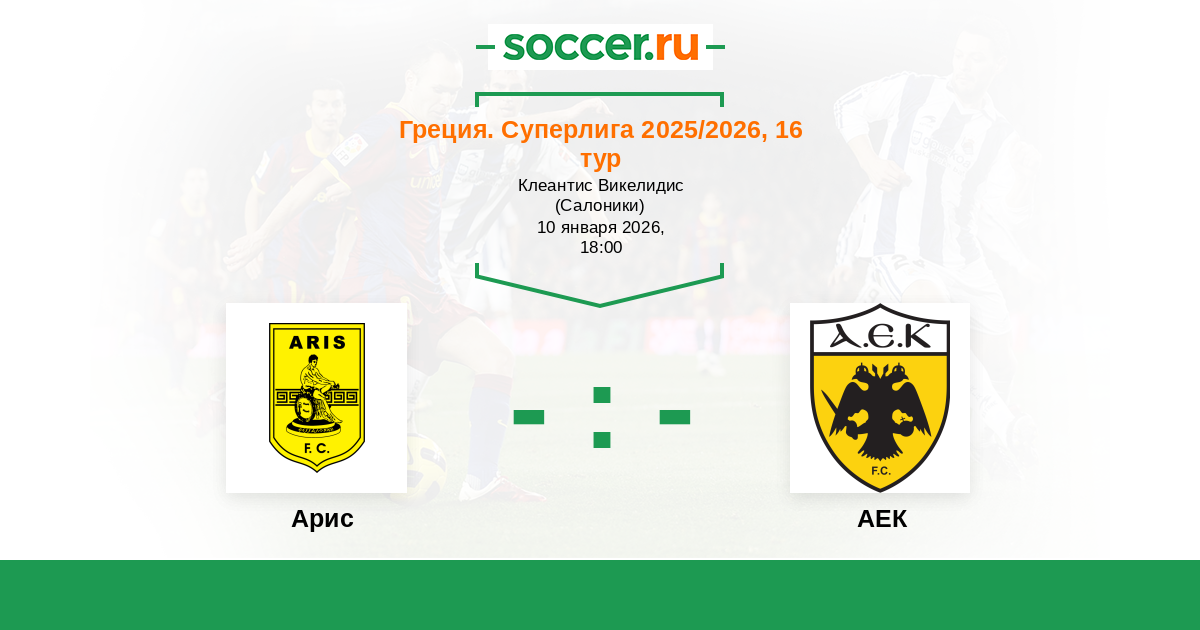 Греция. Суперлига 20.01.2013 Арис Логотип футбольный клуб Арис (Салоники) 1:1 Логотип футбольный клуб АЕК (Афины) АЕК