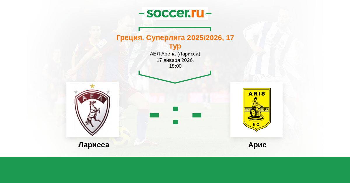Греция. Суперлига 20.01.2019 Ларисса Логотип футбольный клуб Ларисса 0:0 Логотип футбольный клуб Арис (Салоники) Арис