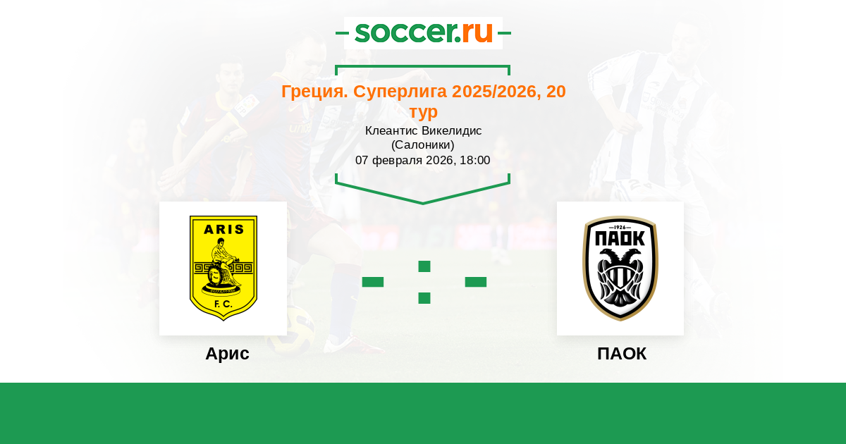 Греция. Суперлига 20.02.2022 Арис Логотип футбольный клуб Арис (Салоники) 0:0 Логотип футбольный клуб ПАОК (Салоники) ПАОК