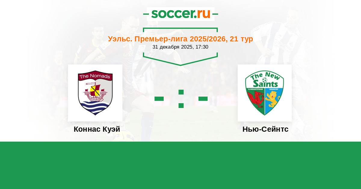 Уэльс. Премьер-Лига 31.12.2024 Нью-Сейнтс Логотип футбольный клуб Нью-Сейнтс (Ллансантффрайд) 2:1 Логотип футбольный клуб Коннас Куэй Коннас Куэй