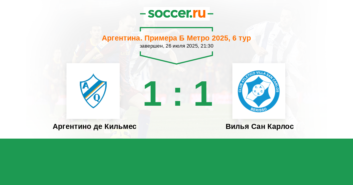 Аргентина. Примера Б Метро 14.08.2021 Аргентино де Кильмес Логотип футбольный клуб Аргентино де Кильмес 1:1 Логотип футбольный клуб Вилья Сан Карлос (Берисо) Вилья Сан Карлос