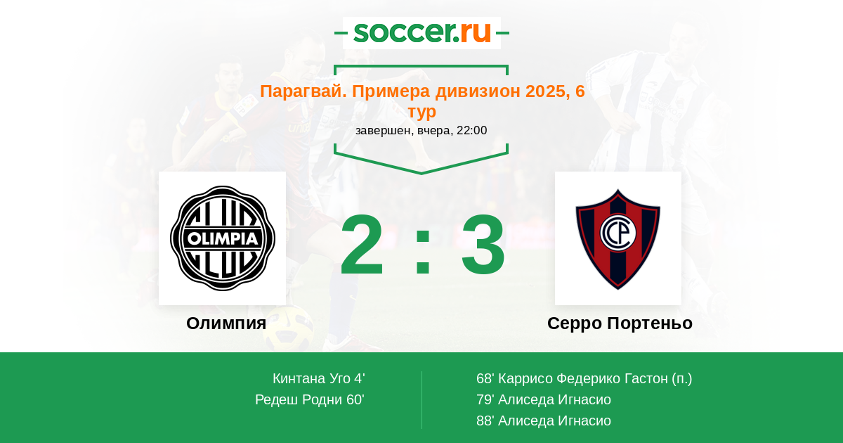 Парагвай. Примера дивизион 22.02.2026 Серро Портеньо Логотип футбольный клуб Серро Портеньо (Асунсьон) 0:1 Логотип футбольный клуб Олимпия (Асунсьон) Олимпия