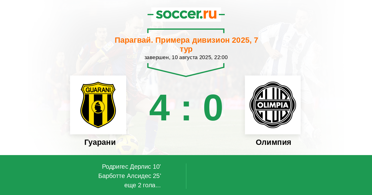 Парагвай. Примера дивизион 07.04.2025 Гуарани Логотип футбольный клуб Гуарани (Асунсьон) 2:1 Логотип футбольный клуб Олимпия (Асунсьон) Олимпия