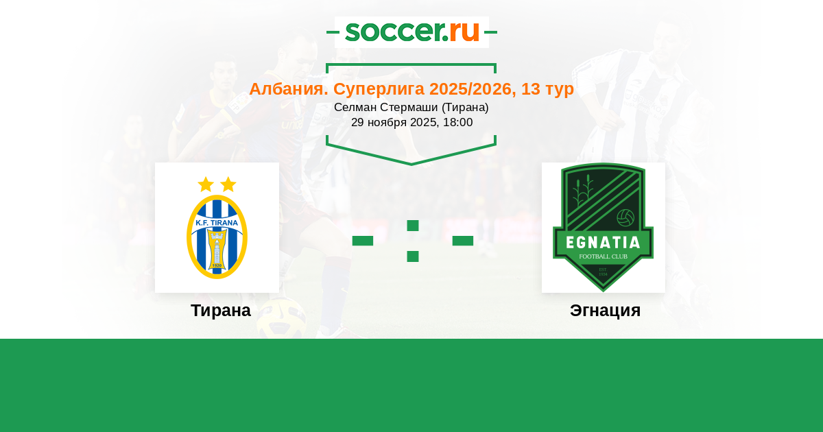 Албания. Суперлига 03.11.2022 Тирана Логотип футбольный клуб Тирана 1:0 Логотип футбольный клуб Эгнация (Рогожина) Эгнация