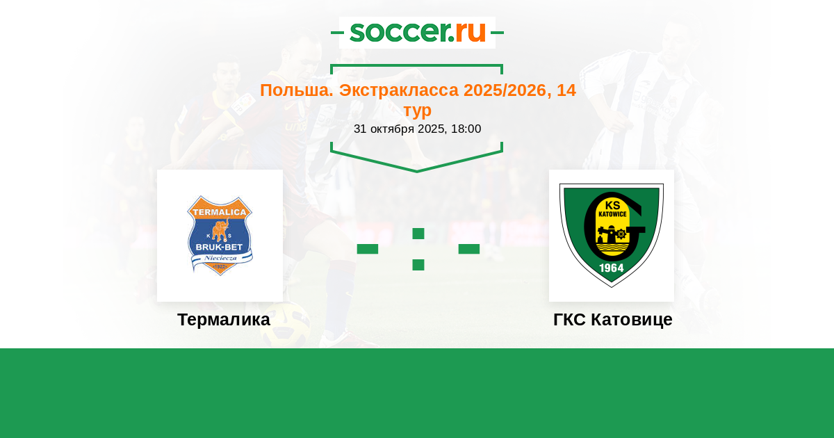 Польша. Первый дивизион 08.10.2023 ГКС Катовице Логотип футбольный клуб ГКС Катовице 0:0 Логотип футбольный клуб Термалика (Нецеча) Термалика