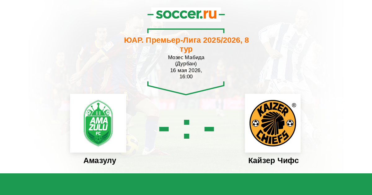 ЮАР. Премьер-Лига 22.11.2017 Амазулу Логотип футбольный клуб Амазулу (Дурбан) 0:0 Логотип футбольный клуб Кайзер Чифс (Йоханнесбург) Кайзер Чифс
