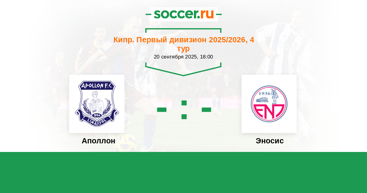 Кипр. Первый Дивизион 29.09.2024 Аполлон Логотип футбольный клуб Аполлон (Лимассол) 3:1 Логотип футбольный клуб Эносис (Паралимни) Эносис