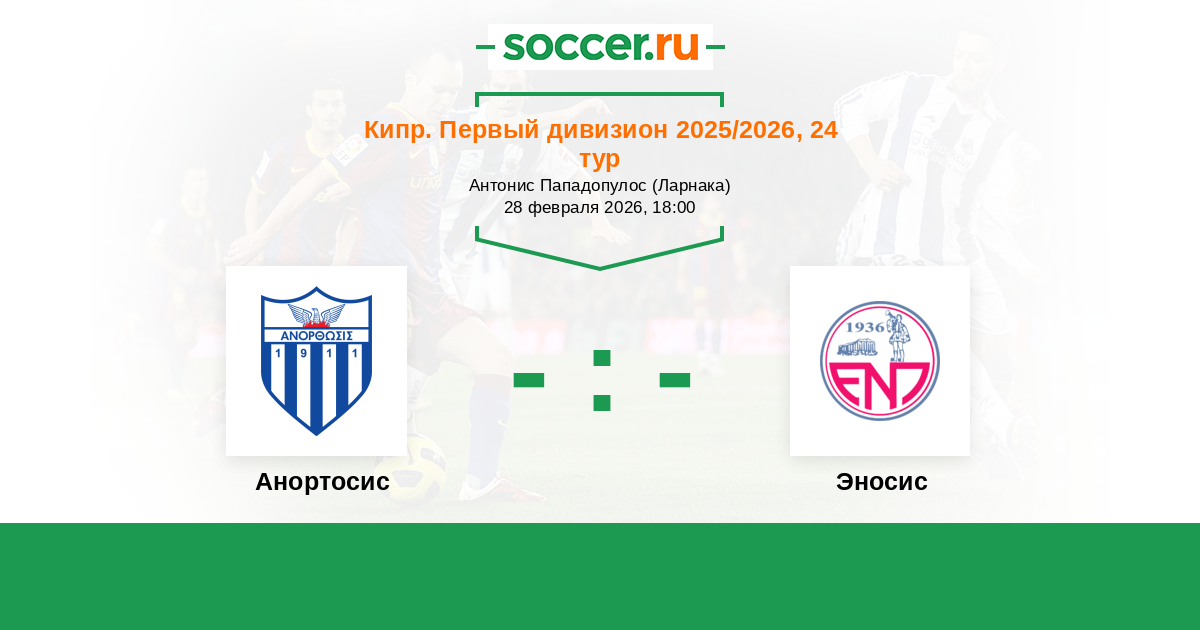 Кипр. Первый Дивизион 17.03.2006 Анортосис Логотип футбольный клуб Анортосис (Ларнака) 0:0 Логотип футбольный клуб Эносис (Паралимни) Эносис