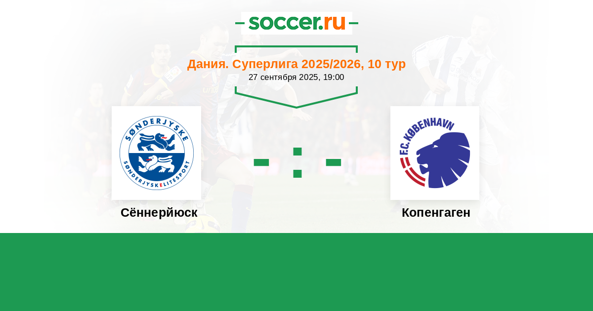 Дания. Суперлига 27.09.2014 Сённерйюск Логотип футбольный клуб Сённерйюск (Хадерслев) 1:1 Логотип футбольный клуб Копенгаген Копенгаген