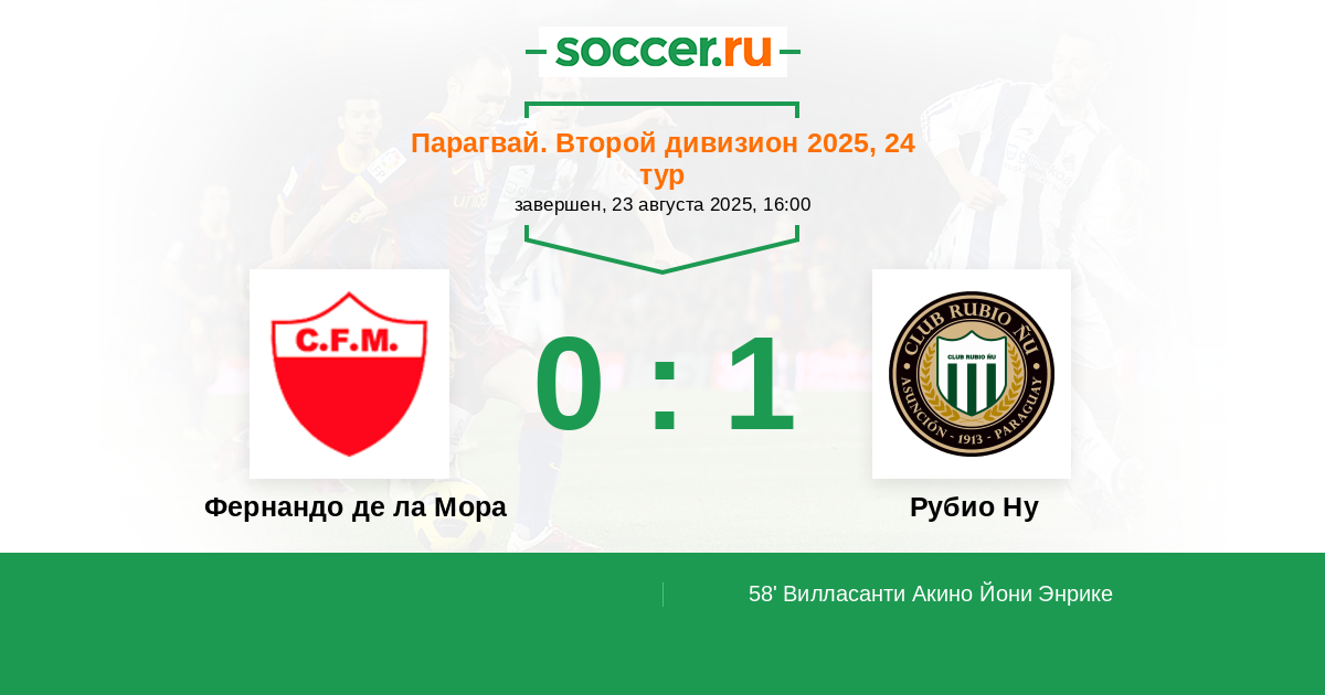 Парагвай. Второй дивизион 22.08.2023 Рубио Ну Логотип футбольный клуб Рубио Ну (Асунсьон) 1:0 Логотип футбольный клуб Фернандо де ла Мора Фернандо де ла Мора