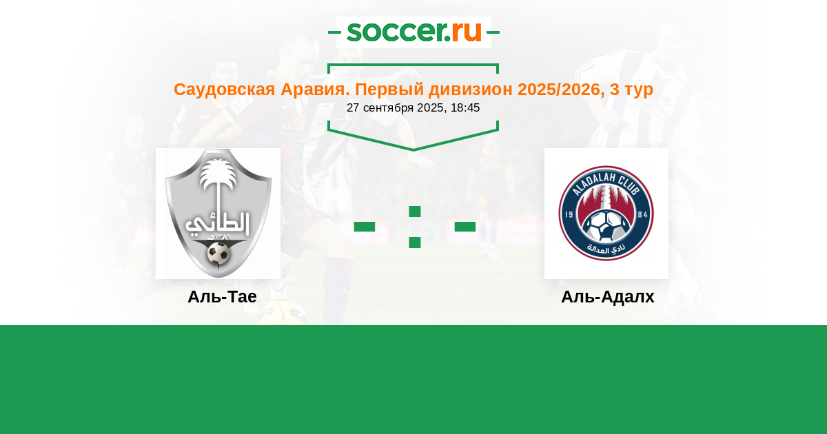 Саудовская Аравия. Первый дивизион 12.09.2018 Аль-Адалх Логотип футбольный клуб Аль-Адалх (Аль-Ахса) 1:0 Логотип футбольный клуб Аль-Тае (Хаиль) Аль-Тае