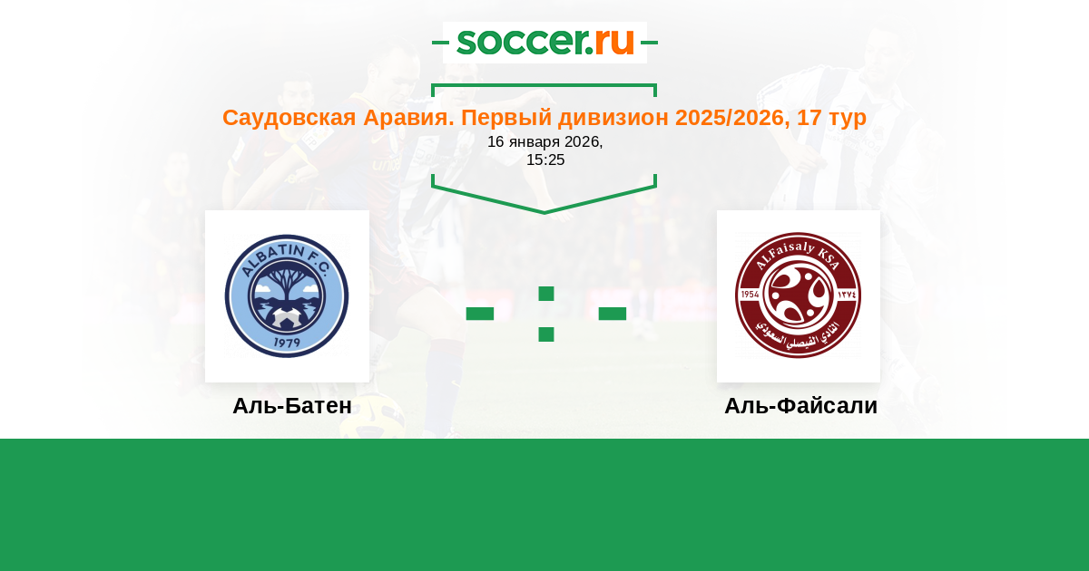 Саудовская Аравия. Первый дивизион 18.12.2024 Аль-Батен Логотип футбольный клуб Аль-Батен (Хафар-аль-Батен) 3:1 Логотип футбольный клуб Аль-Файсали (Хармах) Аль-Файсали