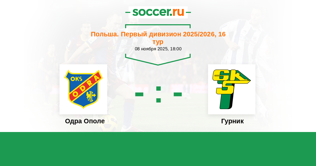 Польша. Первый дивизион 19.11.2017 Гурник Логотип футбольный клуб Гурник (Ленчна) 0:3 Логотип футбольный клуб Одра Ополе Одра Ополе