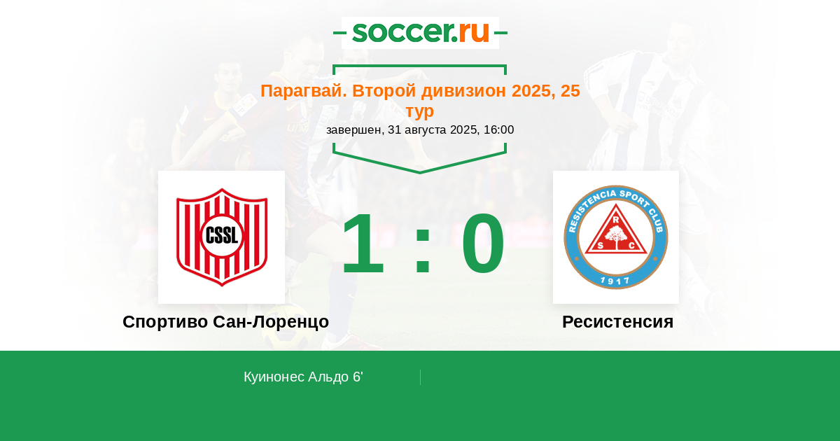 Парагвай. Второй дивизион 14.09.2014 Спортиво Сан-Лоренцо Логотип футбольный клуб Спортиво Сан-Лоренцо 4:0 Логотип футбольный клуб Ресистенсия (Асунсьон) Ресистенсия