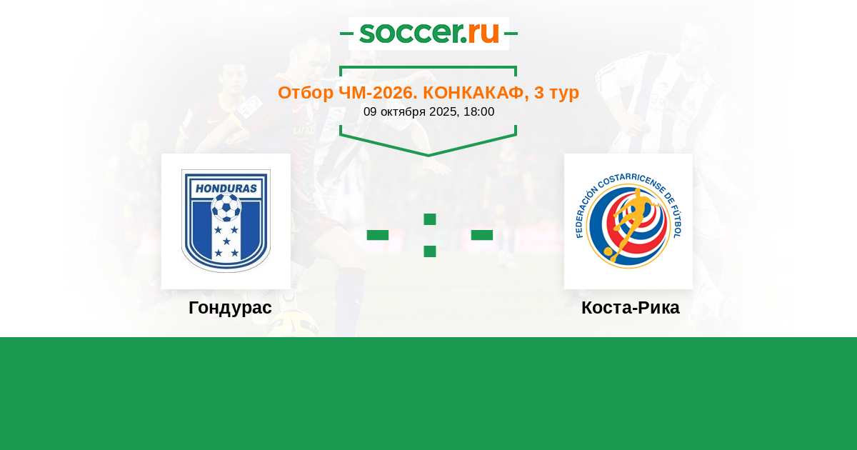 Отбор ЧМ. КОНКАКАФ 19.11.2025 Коста-Рика Логотип Коста-Рика 0:0 Логотип Гондурас Гондурас