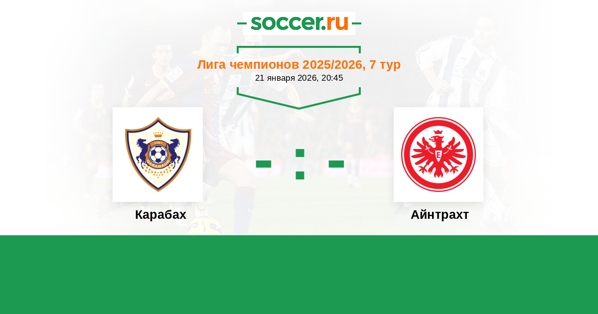 Футбольный клуб Карабах имеет хорошие шансы продолжить выступление в переходном турнире за выход в плей-офф. Айнтрахт ничего особенного не показывает в основном этапе розыгрыша Лиги чемпионов. Азербайджан 🇦🇿 просто обязан выиграть дома у Германии 🇩🇪... Победа хозяев.