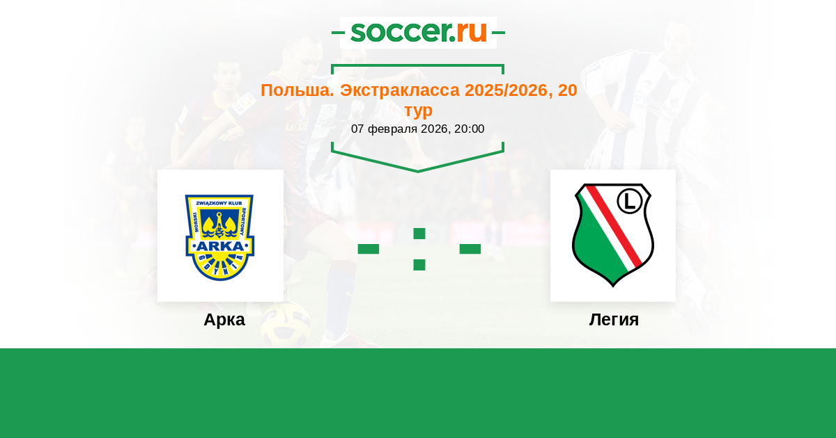 Польша. Экстракласса 03.08.2025 Легия Логотип футбольный клуб Легия (Варшава) 0:0 Логотип футбольный клуб Арка (Гдыня) Арка