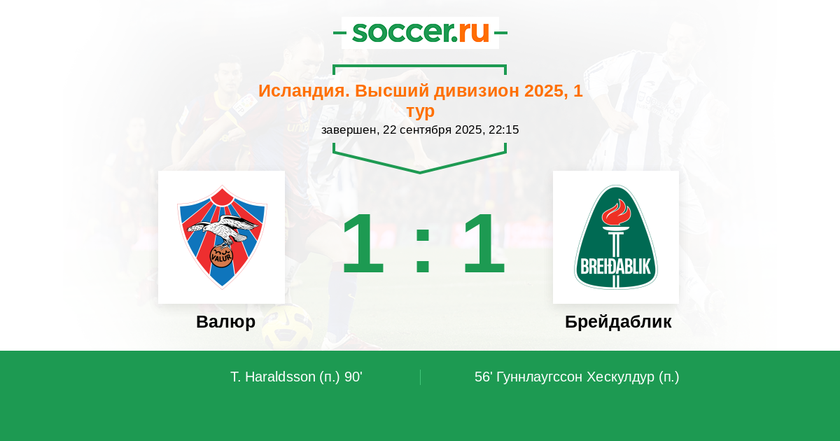 Исландия. Высший дивизион 27.09.2020 Валюр Логотип футбольный клуб Валюр (Рейкьявик) 1:1 Логотип футбольный клуб Брейдаблик (Коупавогюр) Брейдаблик