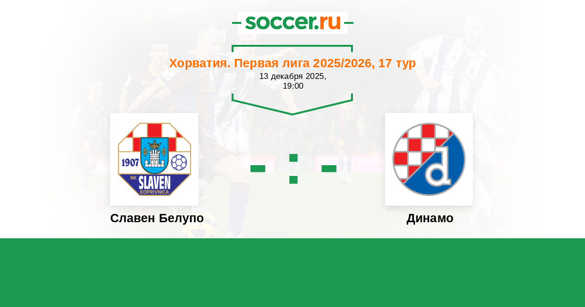 Хорватия. Первая лига 12.12.2021 Динамо Логотип футбольный клуб Динамо (Загреб) 3:0 Логотип футбольный клуб Славен Белупо (Копривница) Славен Белупо