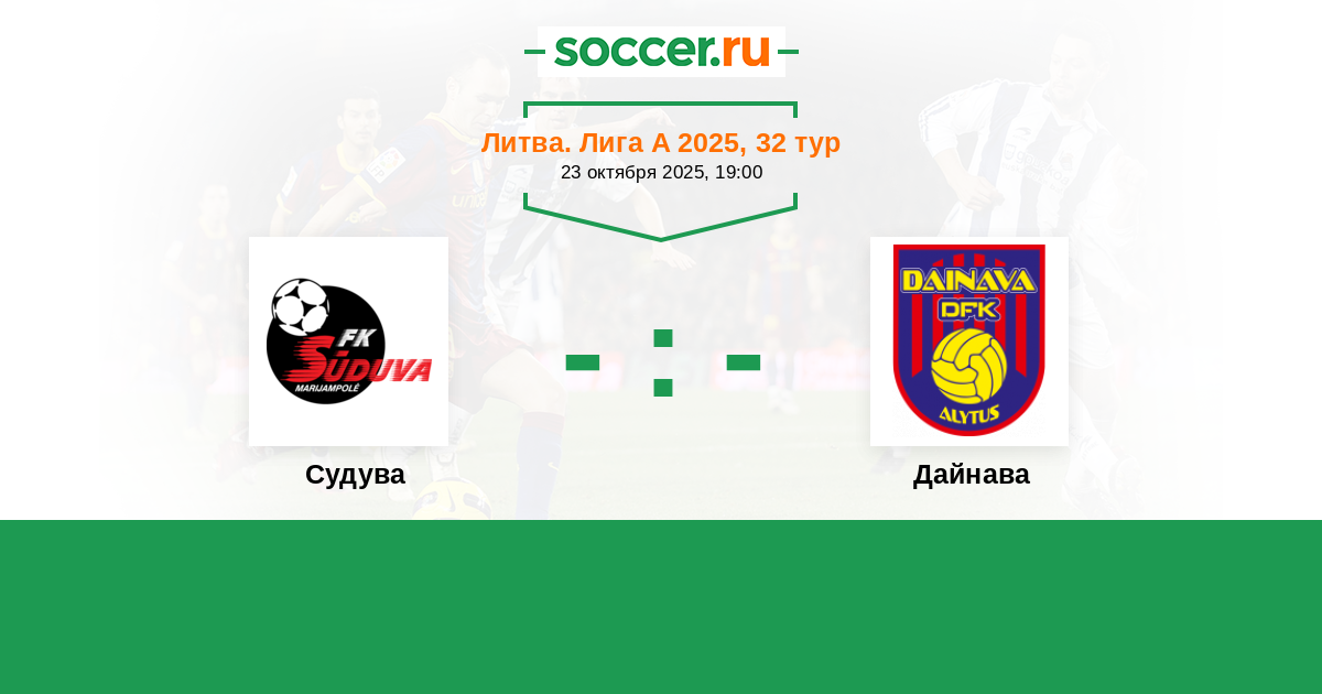 Литва. Лига А 16.05.2025 Дайнава Логотип футбольный клуб Дайнава (Алитус) 0:3 Логотип футбольный клуб Судува (Мариямполе) Судува