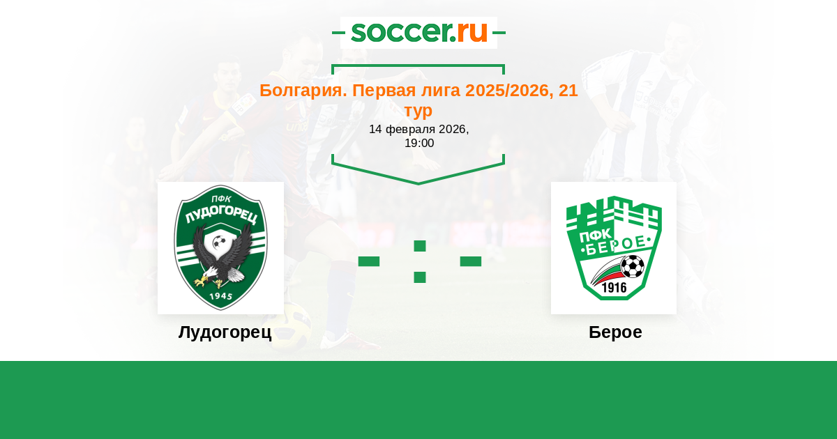 Болгария. Первая лига 26.02.2024 Берое Логотип футбольный клуб Берое (Стара-Загора) 0:2 Логотип футбольный клуб Лудогорец (Разград) Лудогорец