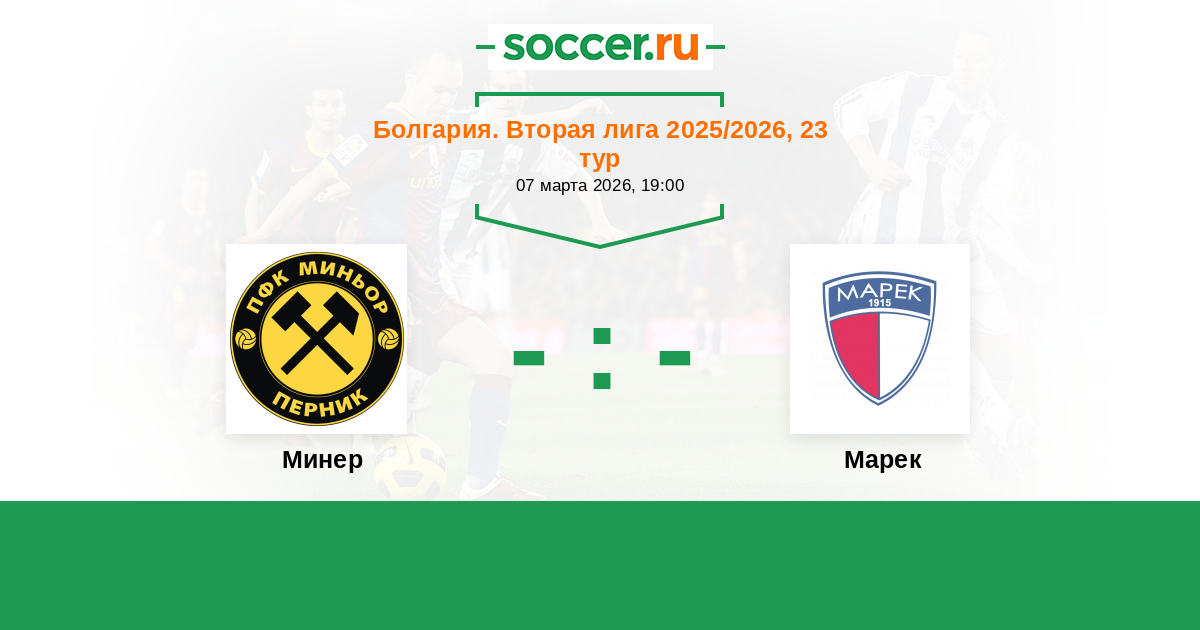 Болгария. Вторая лига 13.08.2021 Минер Логотип футбольный клуб Минер (Перник) 1:1 Логотип футбольный клуб Марек (Дупница) Марек