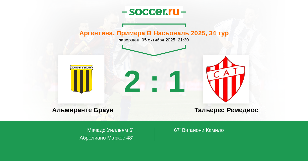 Аргентина. Примера Б Насьональ 01.06.2025 Тальерес Ремедиос Логотип футбольный клуб Тальерес Ремедиос 1:2 Логотип футбольный клуб Альмиранте Браун (Буэнос-Айрес) Альмиранте Браун