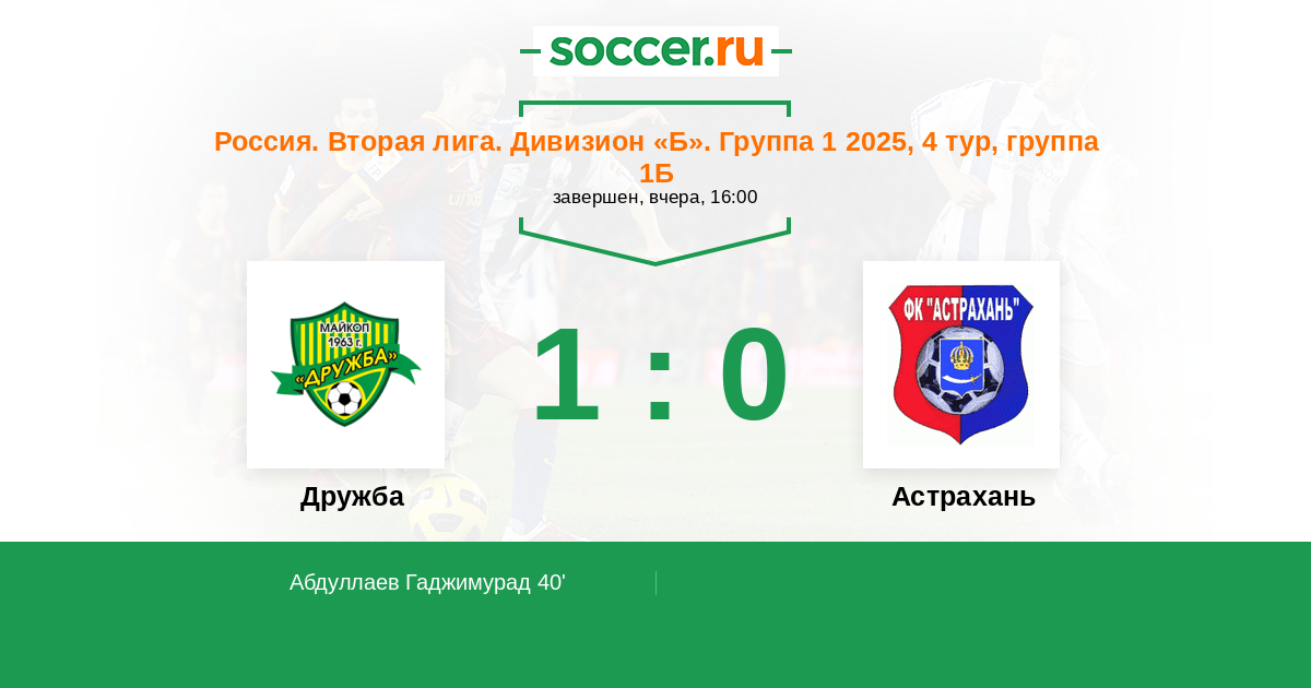 Россия. Вторая лига. Дивизион «Б». Группа 1 02.08.2025 Дружба Логотип футбольный клуб Дружба (Майкоп) 1:1 Логотип футбольный клуб Астрахань Астрахань