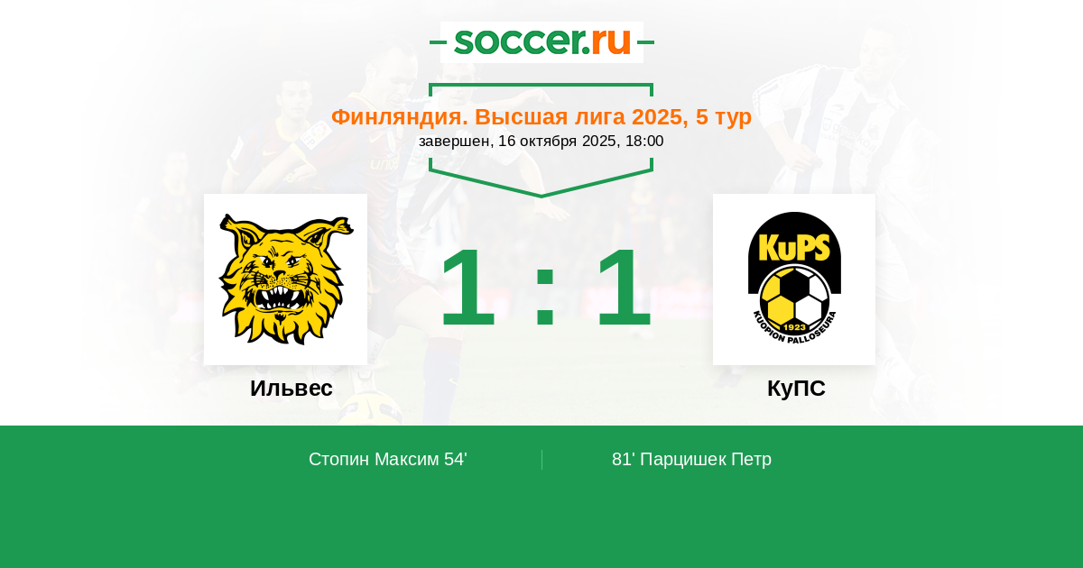 Финляндия. Высшая лига 01.07.2017 Ильвес Логотип футбольный клуб Ильвес (Тампере) 1:0 Логотип футбольный клуб КуПС (Купио) КуПС
