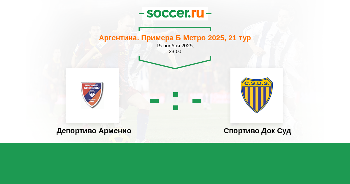 Аргентина. Примера Б Метро 10.11.2024 Спортиво Док Суд Логотип футбольный клуб Спортиво Док Суд (Буэнос-Айрес) 0:2 Логотип футбольный клуб Депортиво Арменио Депортиво Арменио