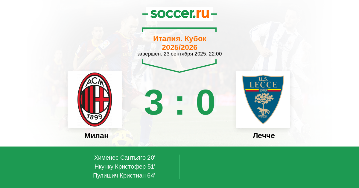Италия. Серия А 27.09.2024 Милан Логотип футбольный клуб Милан 3:0 Логотип футбольный клуб Лечче Лечче