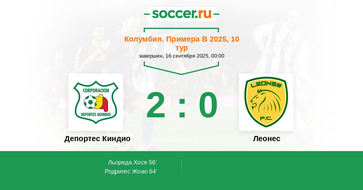 Колумбия. Примера B 09.10.2022 Депортес Киндио Логотип футбольный клуб Депортес Киндио (Армения) 3:2 Логотип футбольный клуб Леонес (Итагуи) Леонес