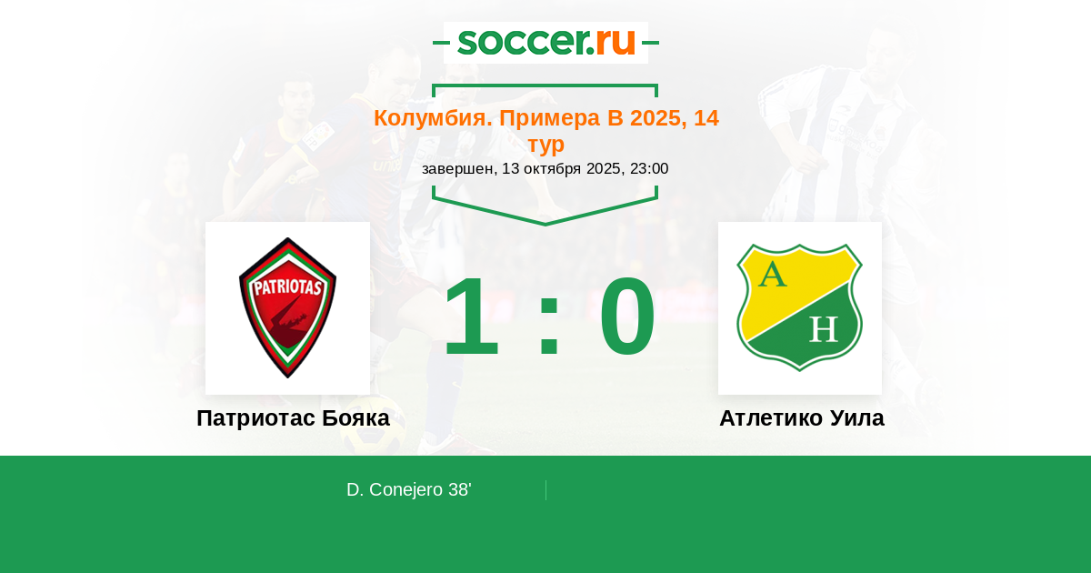 Колумбия. Примера B 10.06.2025 Атлетико Уила Логотип футбольный клуб Атлетико Уила (Нейва) 1:2 Логотип футбольный клуб Патриотас Бояка (Тунха) Патриотас Бояка