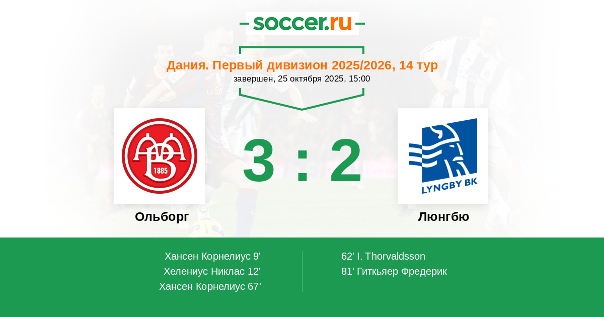 Дания. Первый дивизион 27.09.2025 Люнгбю Логотип футбольный клуб Люнгбю (Конгес Люнгбю) 2:1 Логотип футбольный клуб Ольборг Ольборг